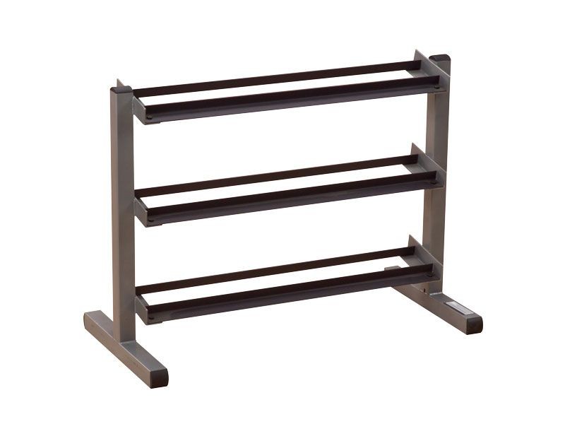 Keep your workout area organized, clean and, most importantly, safe. Our weight trees and dumbbell racks can be placed against any wall or centered in a room. Nobody builds stronger or more space efficient storage units. Heavy gauge steel with all-4-side welded construction is deburred inside and out for user safety. 40" Wide 3-Tier Dumbbell Rack. Holds one (1) pair each of 5-50 lb. hex dumbbells. Rubber coated dumbbells are wider and will fit fewer.